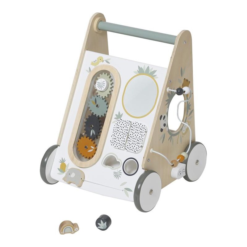 À la fois chariot de marche avec freins pour accompagner les premiers pas de bébé en toute sécurité et tableau d’activités ludiques et éducatives, ce chariot de marche permet de développer la mobilité par la marche comme la mobilité fine, l’apprentissage des formes, des couleurs et des mouvements grâce aux différents ateliers proposés : engrenages, boulier, miroir, formes à encastrer etc...